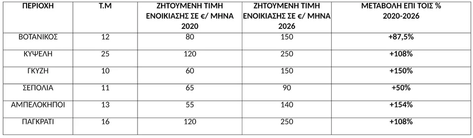 Αντίστοιχα έντονη είναι και η εικόνα στην αγορά ενοικίασης. Στην Κυψέλη, θέση στάθμευσης 25τ.μ. από 120€/μήνα το 2020 ανέρχεται πλέον στα 250€/μήνα (+108%), ενώ στο Γκύζη θέση 10τ.μ. από 60€/μήνα αγγίζει τα 150€/μήνα, καταγράφοντας αύξηση +150%. Στους Αμπελόκηπους, η αύξηση φτάνει το +154%, από 55€ σε 140€/μήνα.