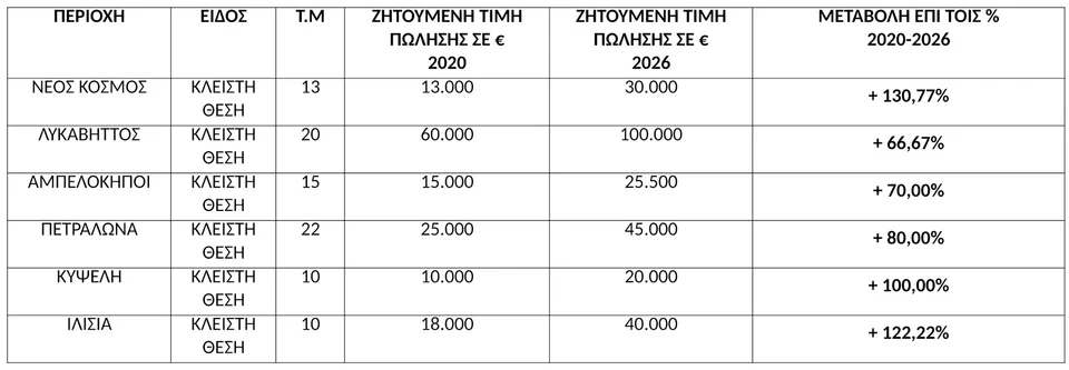 Στις περιοχές όπου εξακολουθούν να υπάρχουν διαθέσιμες θέσεις στάθμευσης, οι ζητούμενες τιμές πώλησης καταγράφουν ραγδαίες αυξήσεις. Ενδεικτικά, στον Νέο Κόσμο, κλειστή θέση στάθμευσης 13τ.μ. από 13.000€ το 2020 διαμορφώνεται πλέον το 2026 στις 30.000€, σημειώνοντας αύξηση +130,77%. Στην Κυψέλη, κλειστή θέση 10τ.μ. από 10.000€ το 2020 έχει ανέλθει στις 20.000€ (+100%), ενώ στα Ιλίσια, θέση 10τ.μ. από 18.000€ αγγίζει πλέον τις 40.000€, καταγράφοντας αύξηση +122,22%. Η μικρότερη ποσοστιαία αύξηση εντοπίζεται στον Λυκαβηττό, όπου κλειστή θέση 20τ.μ. από 60.000€ το 2020 φτάνει πλέον τις 100.000€, σημειώνοντας άνοδο +66,67%.
