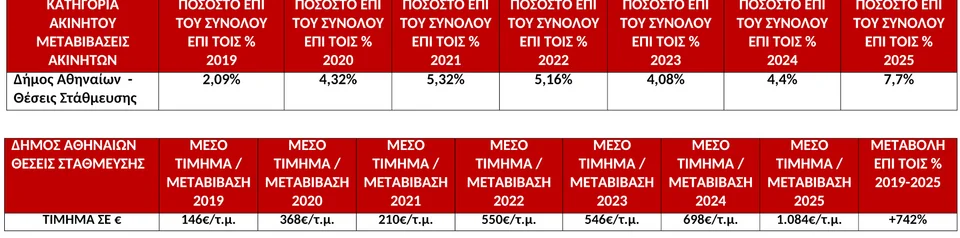 Είναι ενδεικτικό ότι για το 2025 οι μεταβιβάσεις θέσεων στάθμευσης κατέλαβαν το 7,7% του συνόλου, ενώ συνολικά, σε επίπεδο εξαετίας (2019-2025) κατέγραψαν αύξηση άνω του 84% σε σχέση με το 2019, επιβεβαιώνοντας τη σταθερή ενίσχυση της ζήτησης.